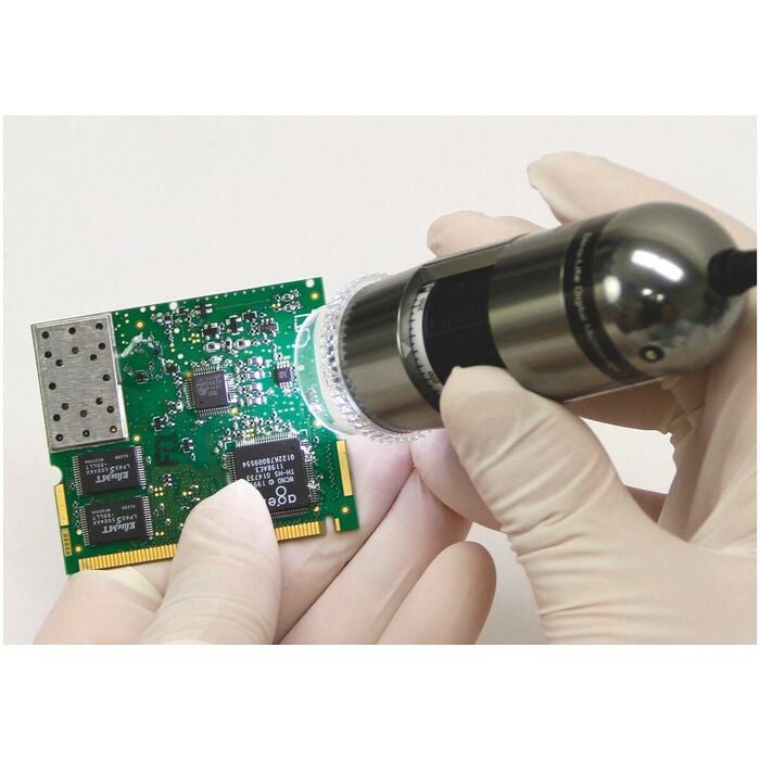 Lättmanövrerat bärbart digitalmikroskop för professionell användning inom olika discipliner. Tack vare CMOS-chipet/USB 2.0-konnektiviteten kan det enkelt anslutas till alla apparater och ger en utomordentlig bildkvalitet och upp till 220 gångers förstoring. Polaristorer minskar reflexer på blanka föremål och förbättrar kontrasten. Förstoringsgraden beror på önskat synfält. Ju mindre synfältet är, desto större kan förstoringen bli. Modeller för långt arbetsavstånd kan användas när ett större avstånd till objektet är nödvändigt. Inklusive intuitiv mätprogramvara för Windows och macOS.