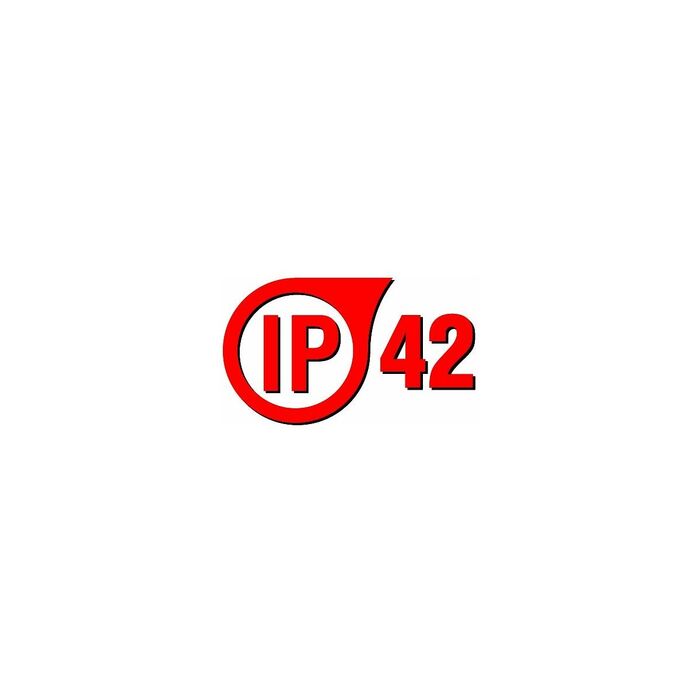IP42: Skydd mot snett infallande vatten (droppvatten) med upp till 15° vinkel mot normalt driftläge och skydd mot inträngande främmande föremål med större diameter än 1 mm, men verktyg och trådar bör hållas på avstånd.
