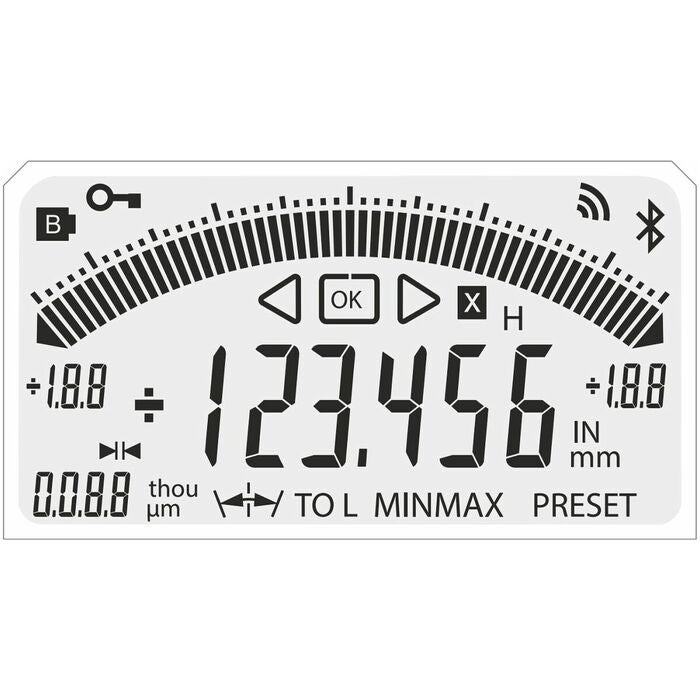 Med extra analogdisplay och knappar för speciell inställning av toleransgränserna. Min/Max/Delta, tolerans, omräkningsfaktor, AutoOff. Måttförinställning (preset) av ett valfritt värde. Räknar riktningsåtervändning. Sparläge och automatisk påslag, absolut system.