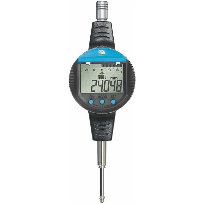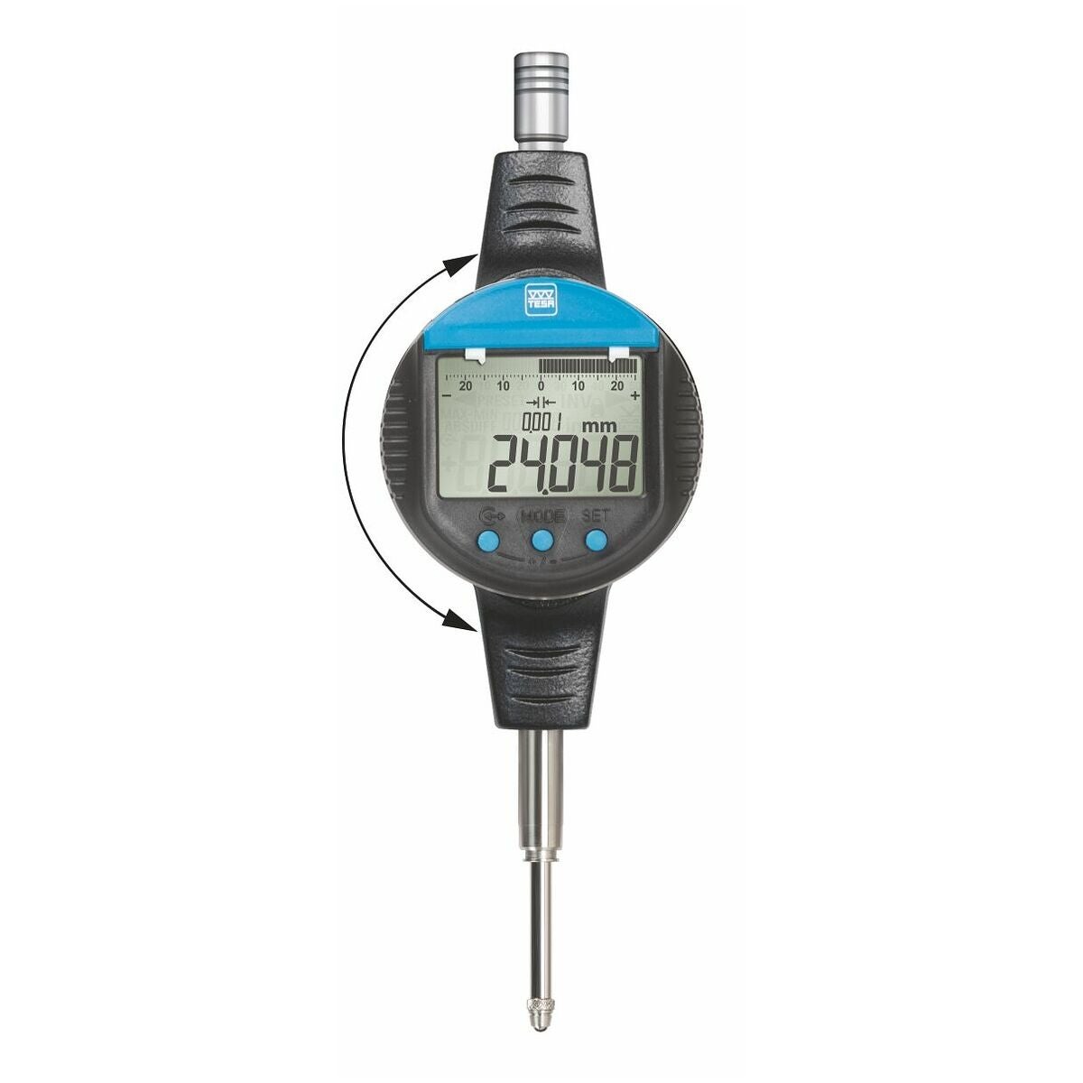 Digitalt mätur med skal- och sifferindikering (sifferhöjd 10 mm) samt mekaniska toleransmarkeringar. Display- och knappdelen kan vridas 270°.