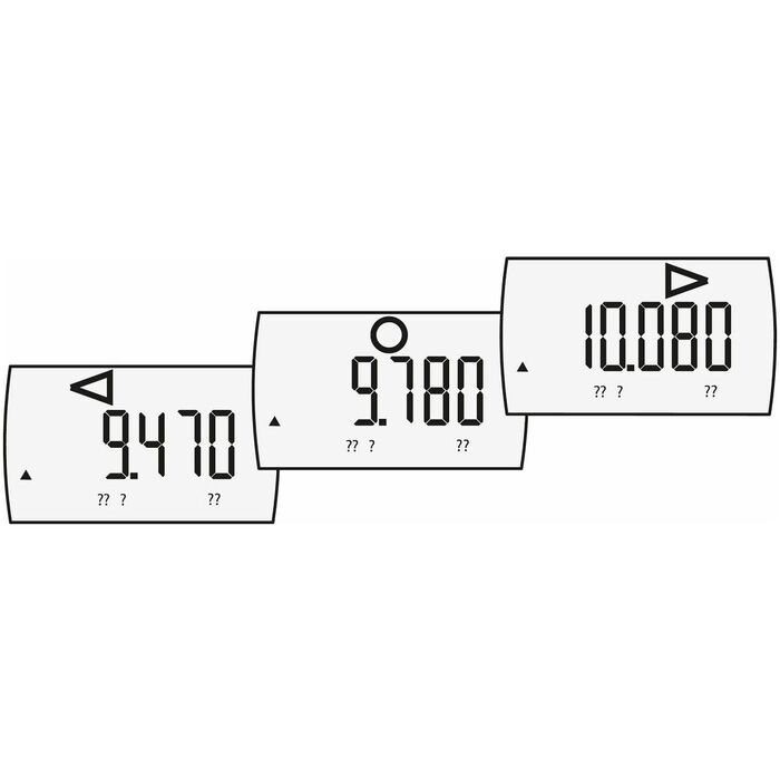 FÖRINSTÄLLNING, tolerans, ABS (displayen kan ställas in på noll utan att FÖRINSTÄLLNINGEN förloras), faktor (multiplikator för mätavstånd), LÅS-funktion (knapplås i menyn). Dataöverföring möjlig.