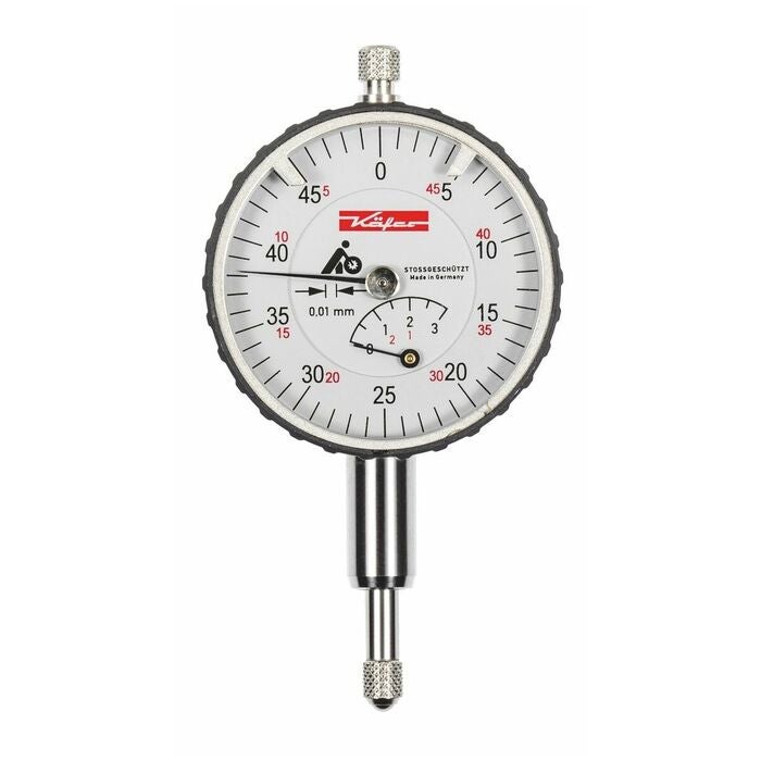 Små precisionsmätklockor med robust metallhölje, fastspänningsskaft ⌀ 8 mm h6, härdat och slipat. Urtavlans ytterring kan vridas för nollställning av visaren.