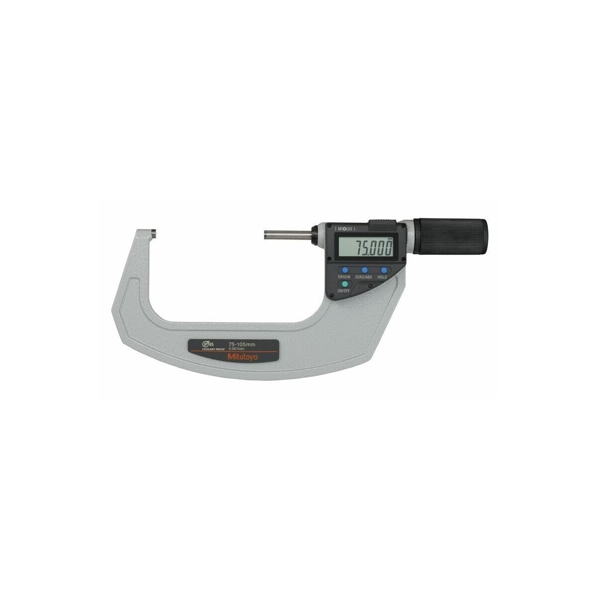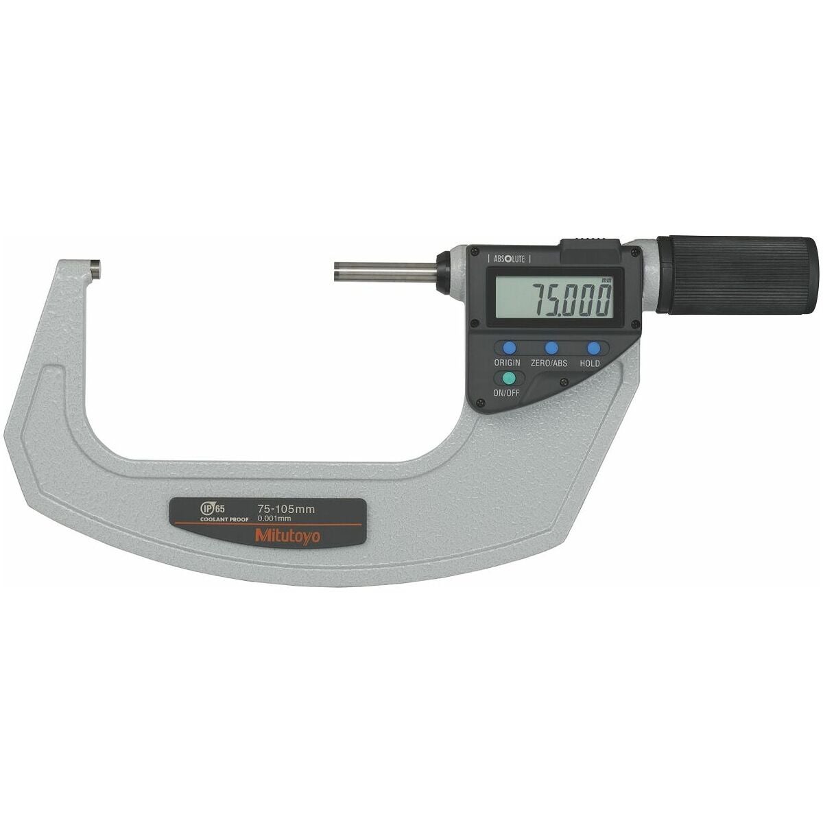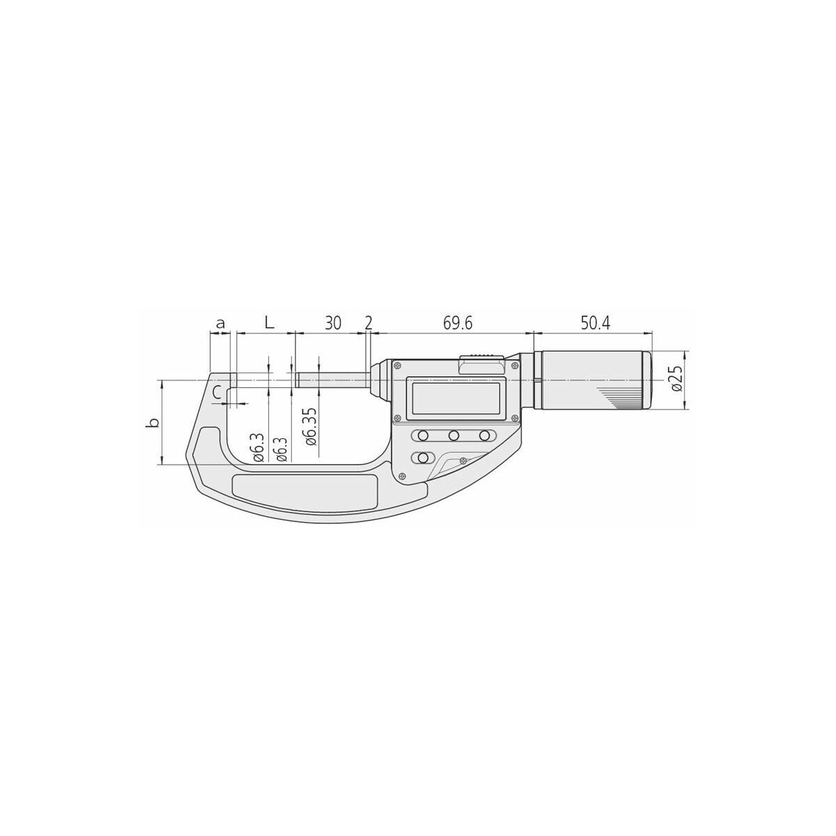 Bygelmikrometer med följande funktioner: Till / från, Origin (grundinställning), Zero / Abs (för nollställning i godtycklig position), Hold / Data (lagring av mätvärden, överföring av data).