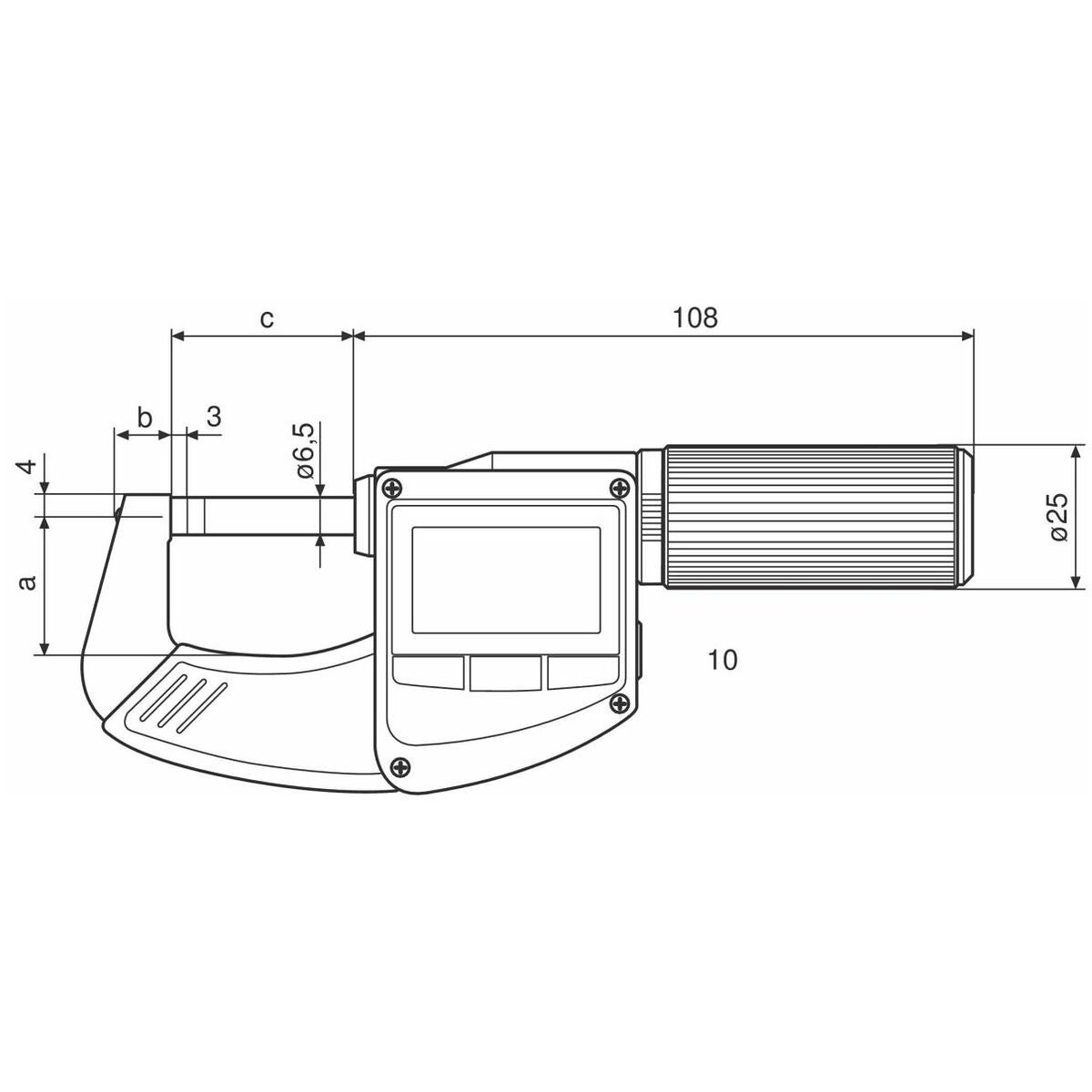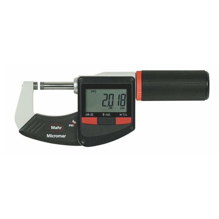 Innovativ bygelmikrometer med 10 mm höga siffror på display med hög kontrast. Praktisk HOLD-funktion för låsning av mätvärdet för säker avläsning. Härdad och slipad mätspindel. Mätytor av hårdmetall. Framflyttad spärrnyckel med snabbfunktion. Lackerad stålbygel med värmeisolering. Omkoppling mellan relativ- och absolutmätning. Nollställning i valfritt läge. Tack vare en bekväm toleransindikering med extra varningsgränser ser operatören om och hur arbetsstycket ligger inom toleransgränserna.