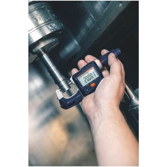 Innovativ bygelmikrometer IP67 HCT med Bluetooth® 5.0 och 12 mm stora siffror på en skärm med hög kontrast. Mycket lång batteridrifttid tack vare ett modernt och energieffektivt mätsystem. Tack vare automatisk avstängning uppnås mycket långa batteritider. Praktisk HOLD-funktion för låsning av mätvärdet för säker avläsning. Härdad och slipad mätspindel. Mätytor av hårdmetall och fasade. Framflyttad spärrnyckel med snabbfunktion. Lackerad stålbygel med värmeisolering. Omkoppling mellan relativ- och absolutmätning. Nollställning i valfritt läge.
