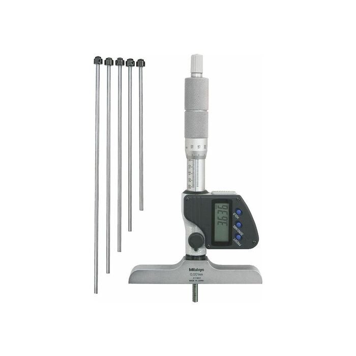 För att de olika mätdjupen ska nås byts mätnålarna med 25 mm steg ut. Helt härdad och slipad spindel. Brygga av härdat verktygsstål med lappad mätyta, mattförkromad mikrometer. Mättrumma med snyggt graverade svart utformade skalstreck och siffror. Konstant mättryck genom det inbyggda känselvredet.