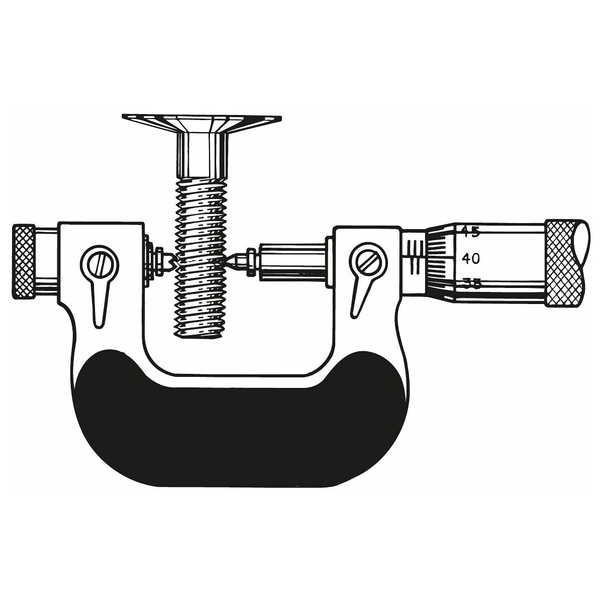 Härdad och slipad mätspindel med hål för mätinspetsar. Bländfri, förkromad mättrumma. Med känselvred (friktionskoppling) och med snabbdrift för snabb inställning. Värmeisolerad bygel.