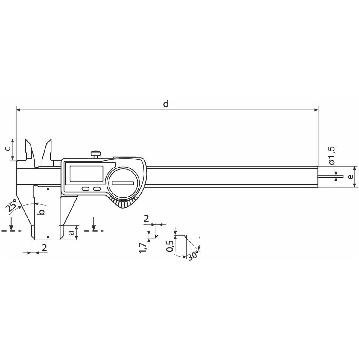 Digitalt skjutmått med spetsiga mätskänklar och runt djupmått 150 mm