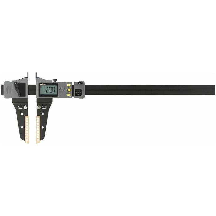 Extremt lätt skjutmått. Mätskena av ihålig aluminiumprofil, mycket hög styvhet tack vare fyra härdade och slipade stålstänger. Mycket stor LCD-display med en sifferhöjd på 20 mm. Ytterskänklar av rostfritt och härdat stål med titanbeläggning. Mätkraftsbegränsning för konstant mätkraft (7,5−11,5 N). Utbytbara cylindriska stift för invändiga mätningar. Funktioner: Förinställning, max/min, delta, visning av övre och nedre toleransgränser.