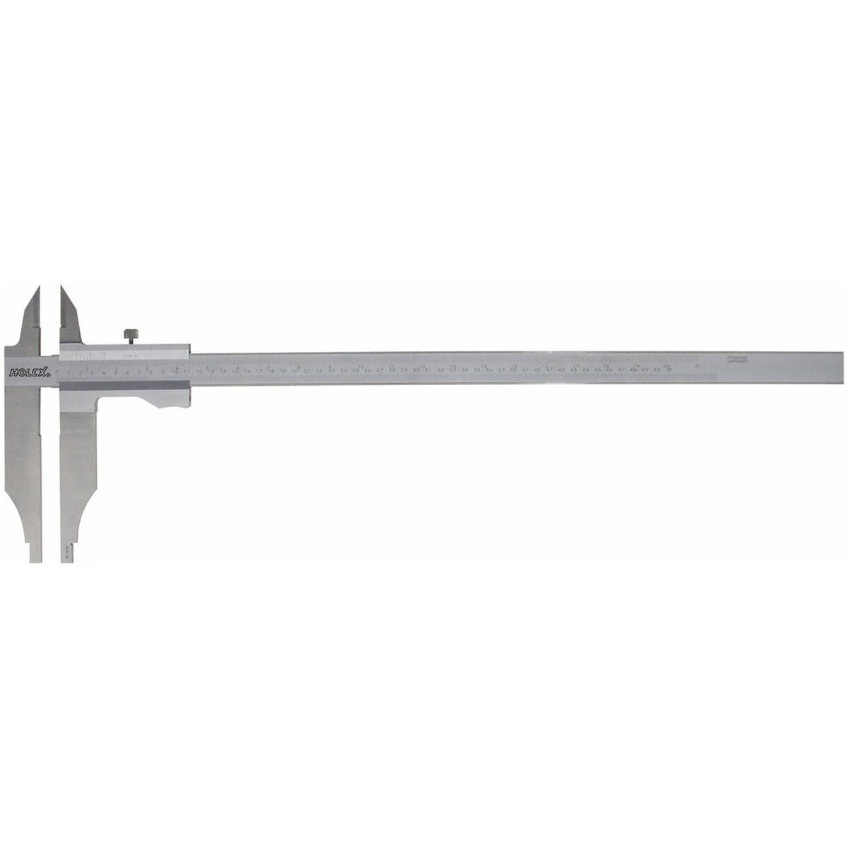 Avfasade mätspetsar för mätningar i gängbotten och i smala instick. Fasade och rundade skänkelspetsar för invändig mätning. Kontrastrik skala. Med låsskruv Upp till strl 300 helt härdat, från strl 500 härdade mätytor.