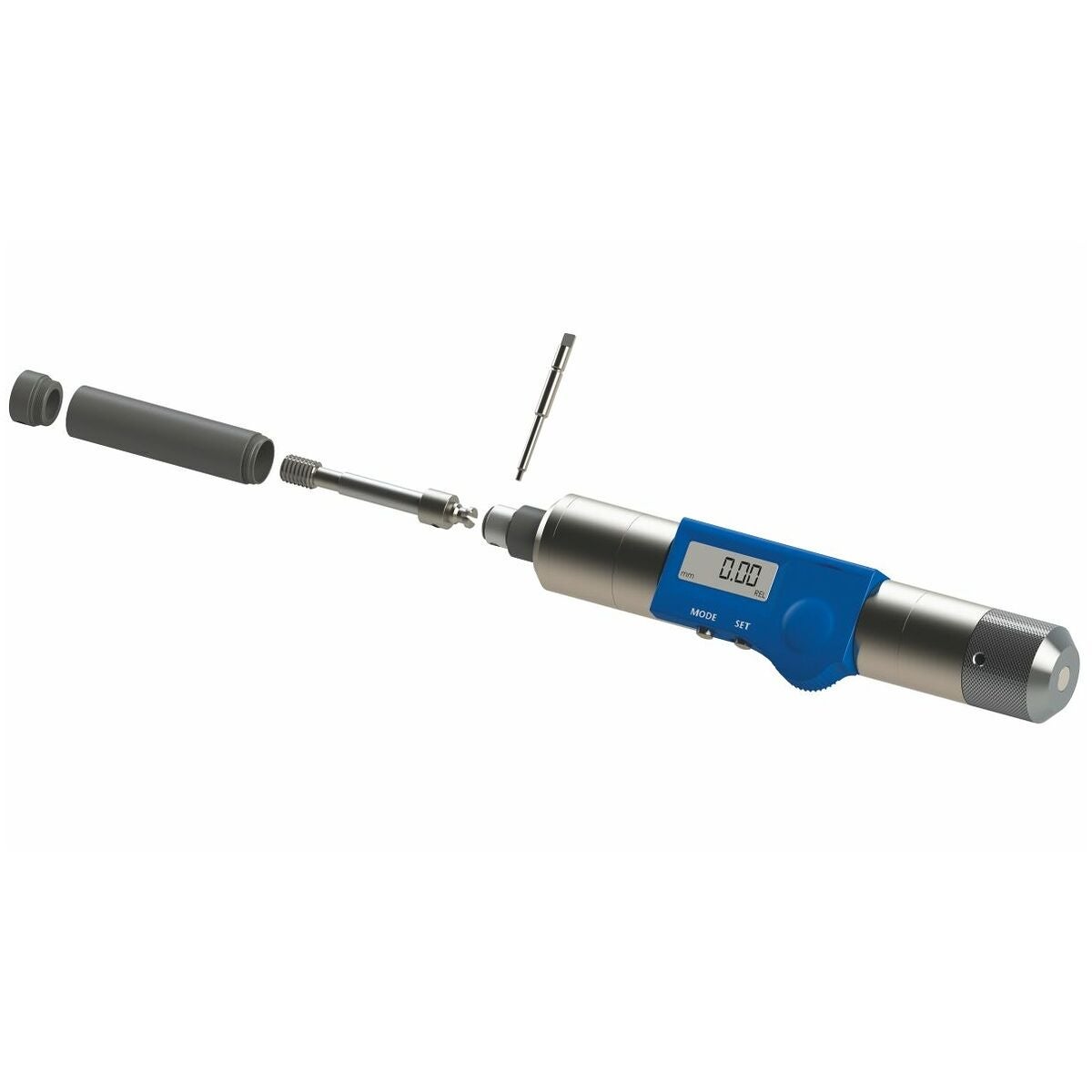Basapparat MultiCheck Digital med utbytestolkinsatser, mäthylsa och skyddshylsa för kontroll av tolkens riktighet och mätning av gängdjupen. Mätdjup upp till 4 × D, högt 80 mm.