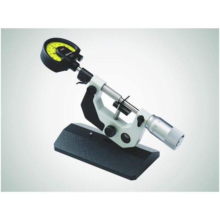 Kraftig stålbygel, kan lutas 45° mot stabil fotplatta. Höjdinställbart anslag. Mätspindel av rostfritt stål, härdad och slipad. Mätytorna hårdmetallbelagda. Manöver- och avläsningsdelar mattförkromade. Med isoleringsskydd. Konstant mätkraft. Rörligt motstäd, lyftning med returspak. Mycket lämplig för precisionstillverkade seriedetaljer och snabbkontroller.