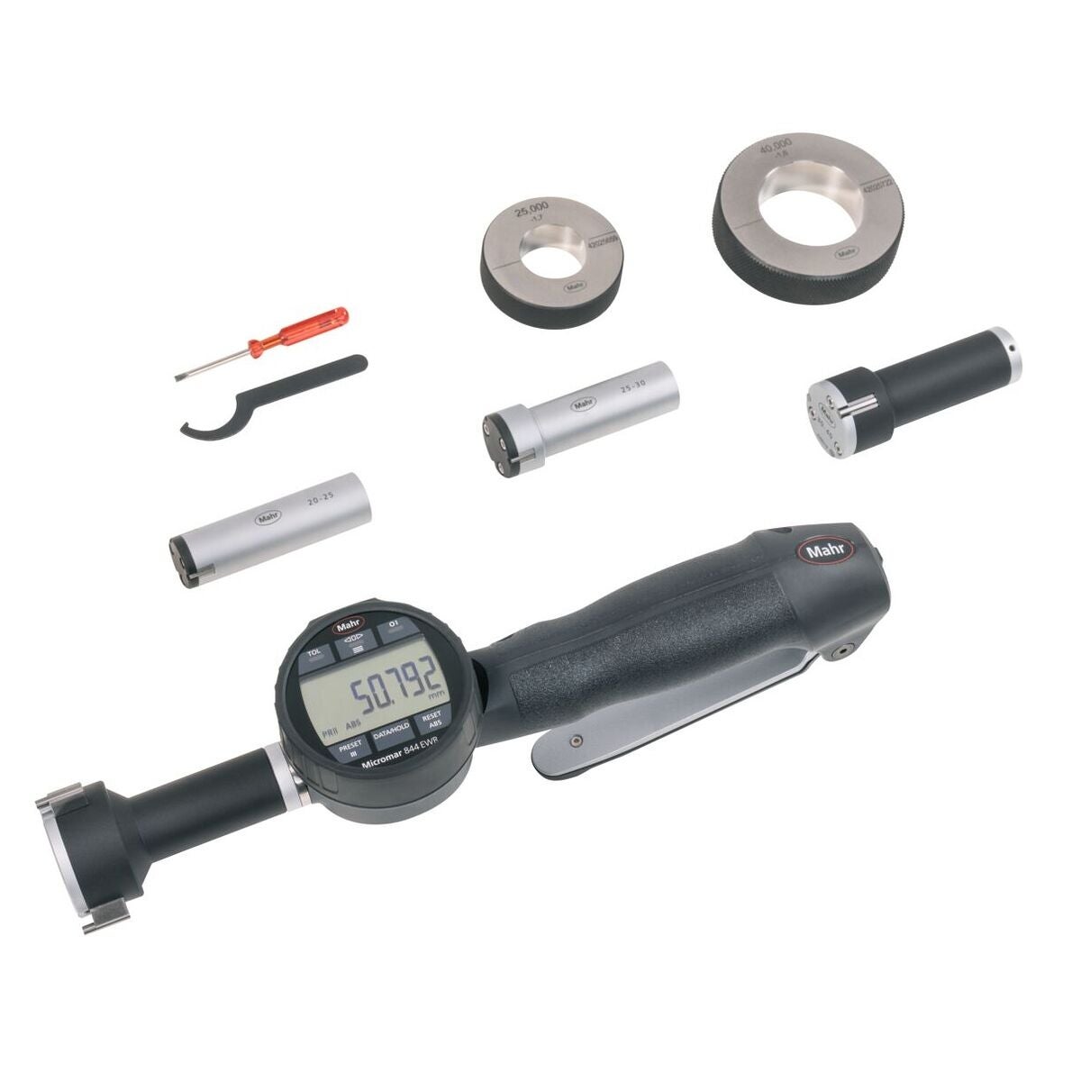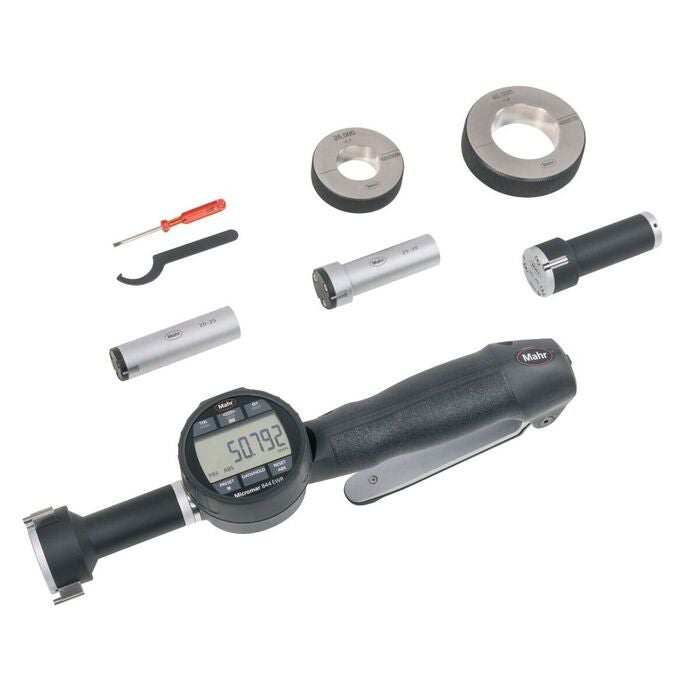 3-punkts-innermikrometrar, respektive invändiga snabbmätare med anslutningsgänga för enkel byte av mäthuvuden. Självcentrerande mäthuvud, från 12 mm med mätbackar av hårdmetall. Från 40 mm mäthuvud av aluminium för att spara vikt.