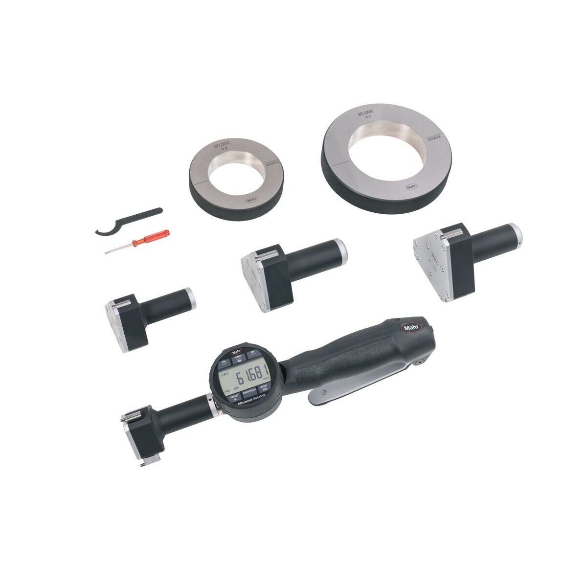 3-punkts-innermikrometrar, respektive invändiga snabbmätare med anslutningsgänga för enkel byte av mäthuvuden. Självcentrerande mäthuvud, från 12 mm med mätbackar av hårdmetall. Från 40 mm mäthuvud av aluminium för att spara vikt.