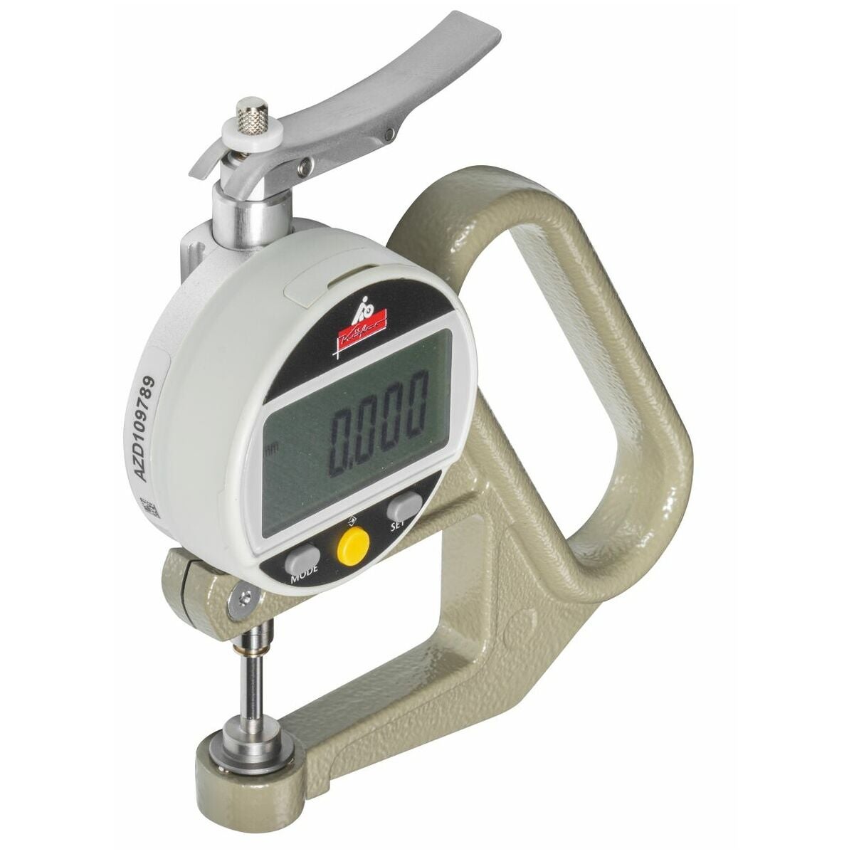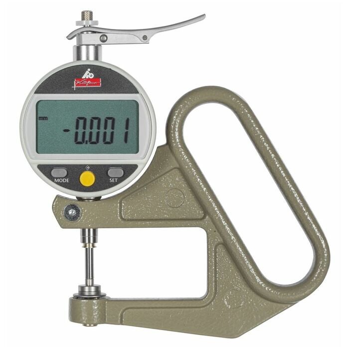 Digital tjocklekssnabbmätare med lyftknapp (mätkraft oberoende av användaren), ram med lätt utförande, lackerad. Härdade och slipade mätytor.