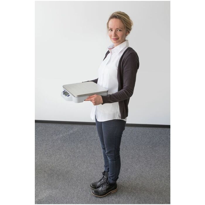 Stor bakgrundsbelyst LCD-display (sifferhöjd 21 mm). Vågplatta av rostfritt stål.