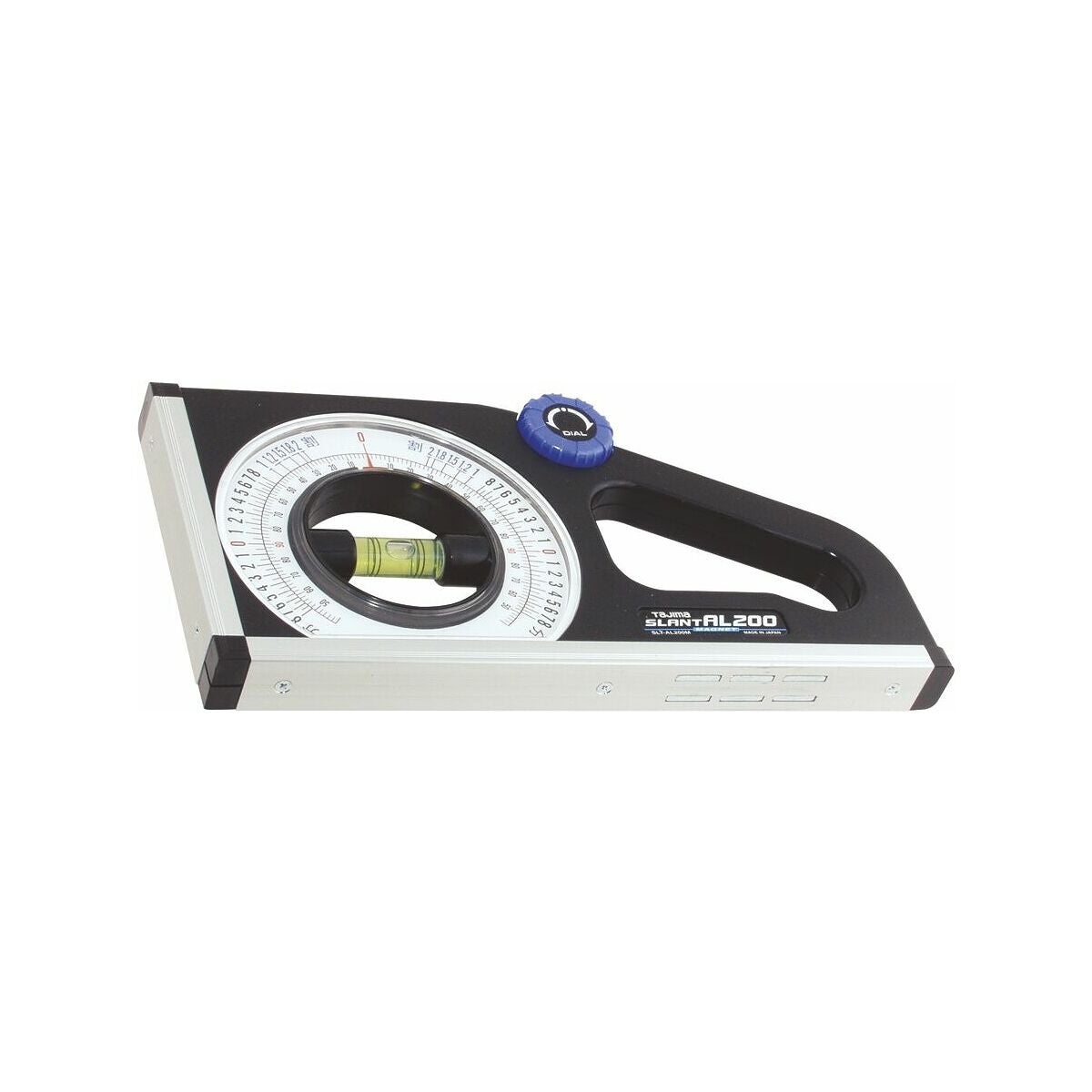 Smidig, praktisk lutningsmätare. Bottenplatta av aluminium med infällda magneter. De vridbara libellerna kan ställas in med handhjul. Vridskalan graderad i grader och mm/m.