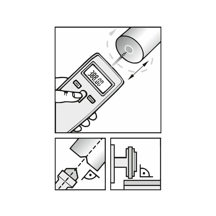 Beröringsfri mätning med reflexmärke, kontaktmätning med påstickbar mekanikadapter, minne med antingen maximivärde, minimivärde eller senaste värde via MODE-knapp. Automatisk avstängning 30 sekunder efter sista knapptryckning.