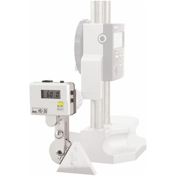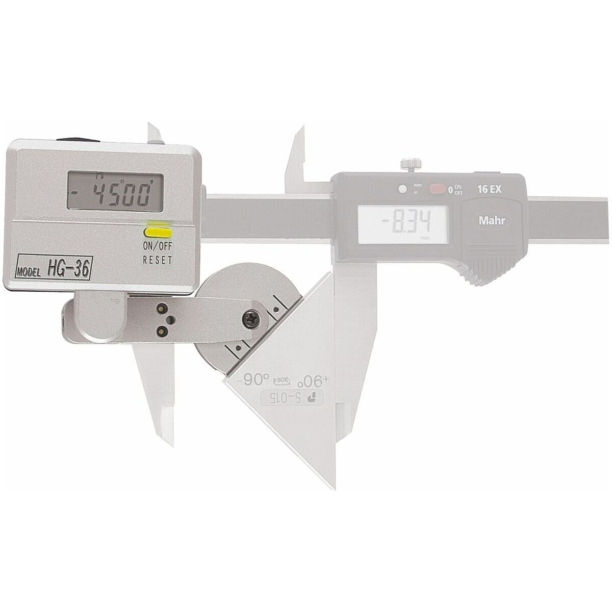 För enkel mätning av vinklar på arbetsstycken. Kan användas tillsammans med skjutmått eller höjdmätare. Mycket enkel montering på skjutmått med två klämskruvar. Med fyrkanthållare för montering på höjdmätare och höjdritsmått.