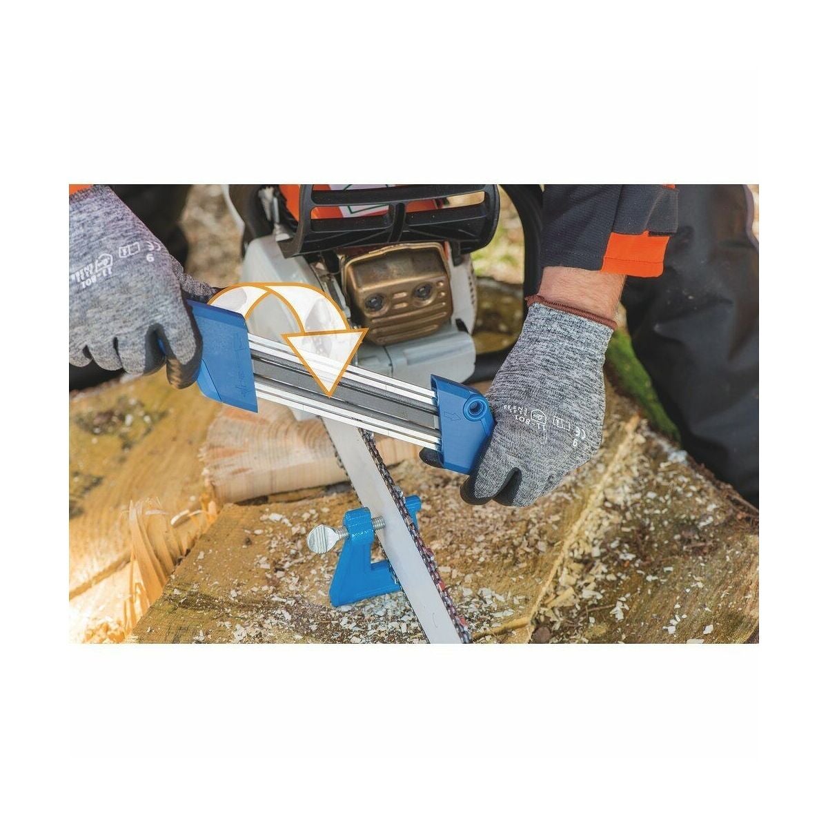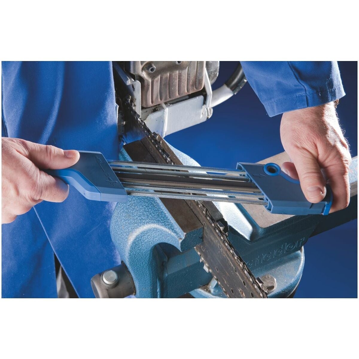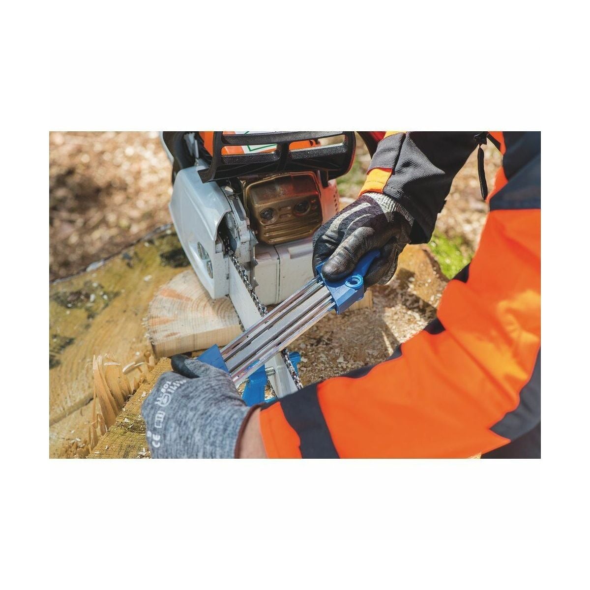 För exakt skärpning för hand, där tänderna i ett arbetsmoment filas med rätt vinkel och djupbegränsaren filas i rätt förhållande till denna. Mer skonsam än maskinell skärpning, vilket ger sågkedjan bättre hållbarhet och längre brukstid.
