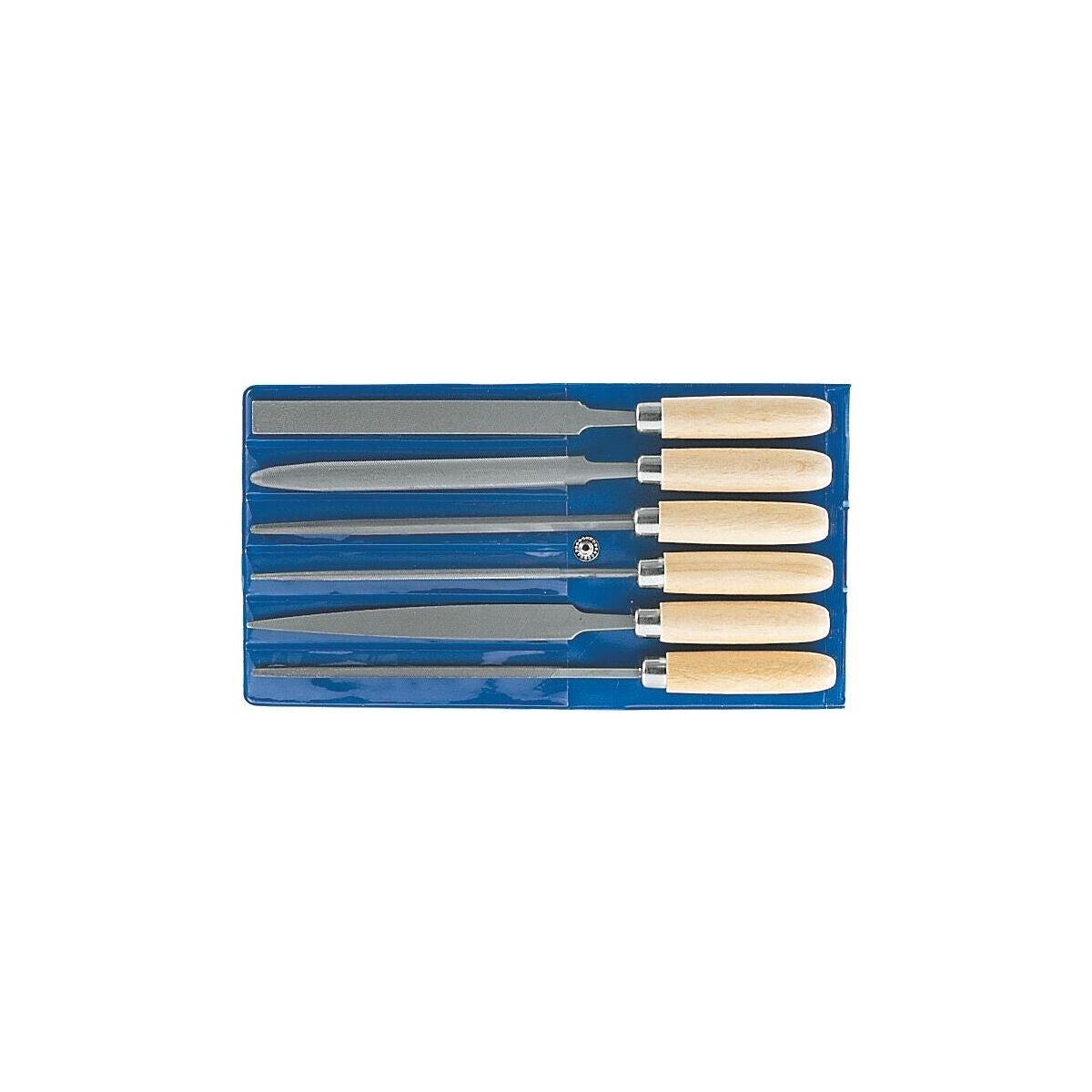 Nyckelfilsats 6 delar med 1 nyckelfil av varje − flat spetsig, ansats, halvrund, rund, trekant, fyrkant. Längd utan tånge 100 mm, huggning 2.