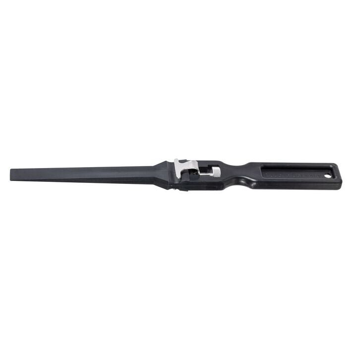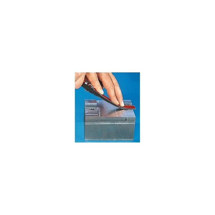 Av flexibelt plastmaterial med kilformad arkyta. Snabb och säker inspänning av slipbandet med klämma och åtdragningsskruv. Totallängd 280 mm, sliplängd 120 mm.