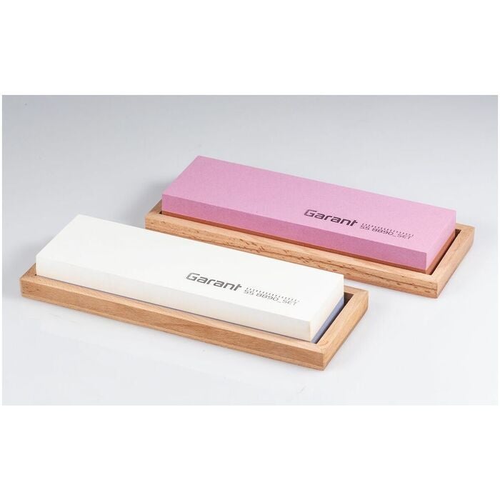 Vardera en knivbrynsten med korn 400/800 (grovslipning) och korn 1000/6000 (finslipning) i förvaringsboxar av bokträ.