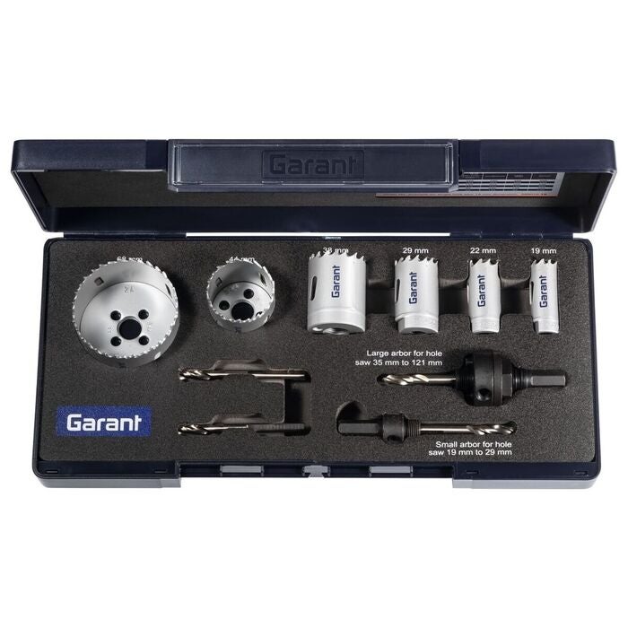 Stötsäker box av plast med bimetall-hålsågar, monteringsskaft och centrerborr.