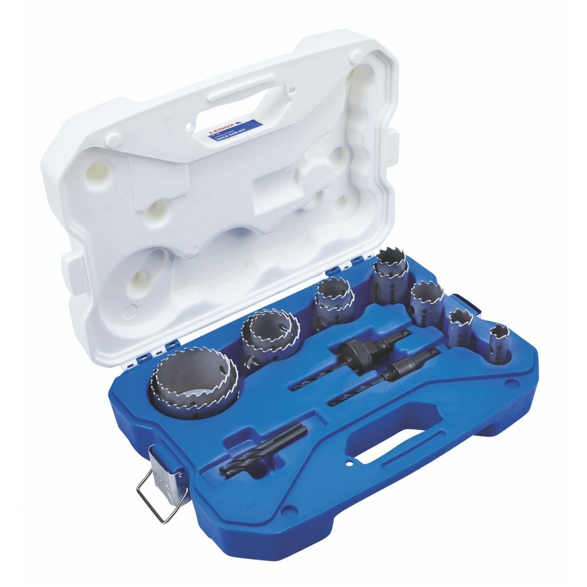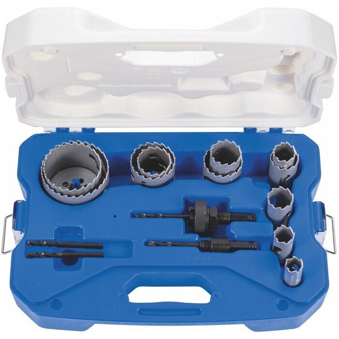Stötsäker plastbox med HM-hålsågar, monteringsskaft och centrerborrar.