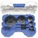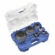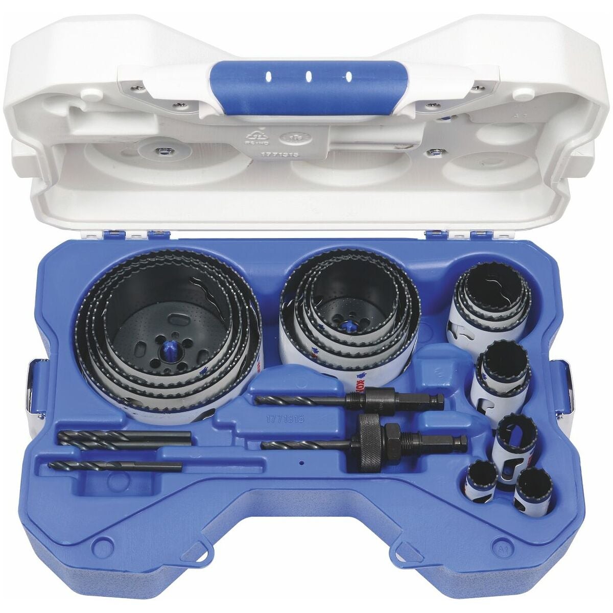 Stötsäker box av plast med bimetall-hålsågar, monteringsskaft och centrerborr.