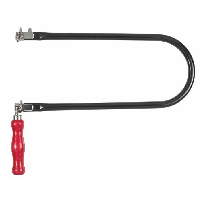 Stabil, lackerad båge av 13 mm stålrör. Skärdjup320 mm. Inspänning med vingmuttrar; lackerat trähandtag.