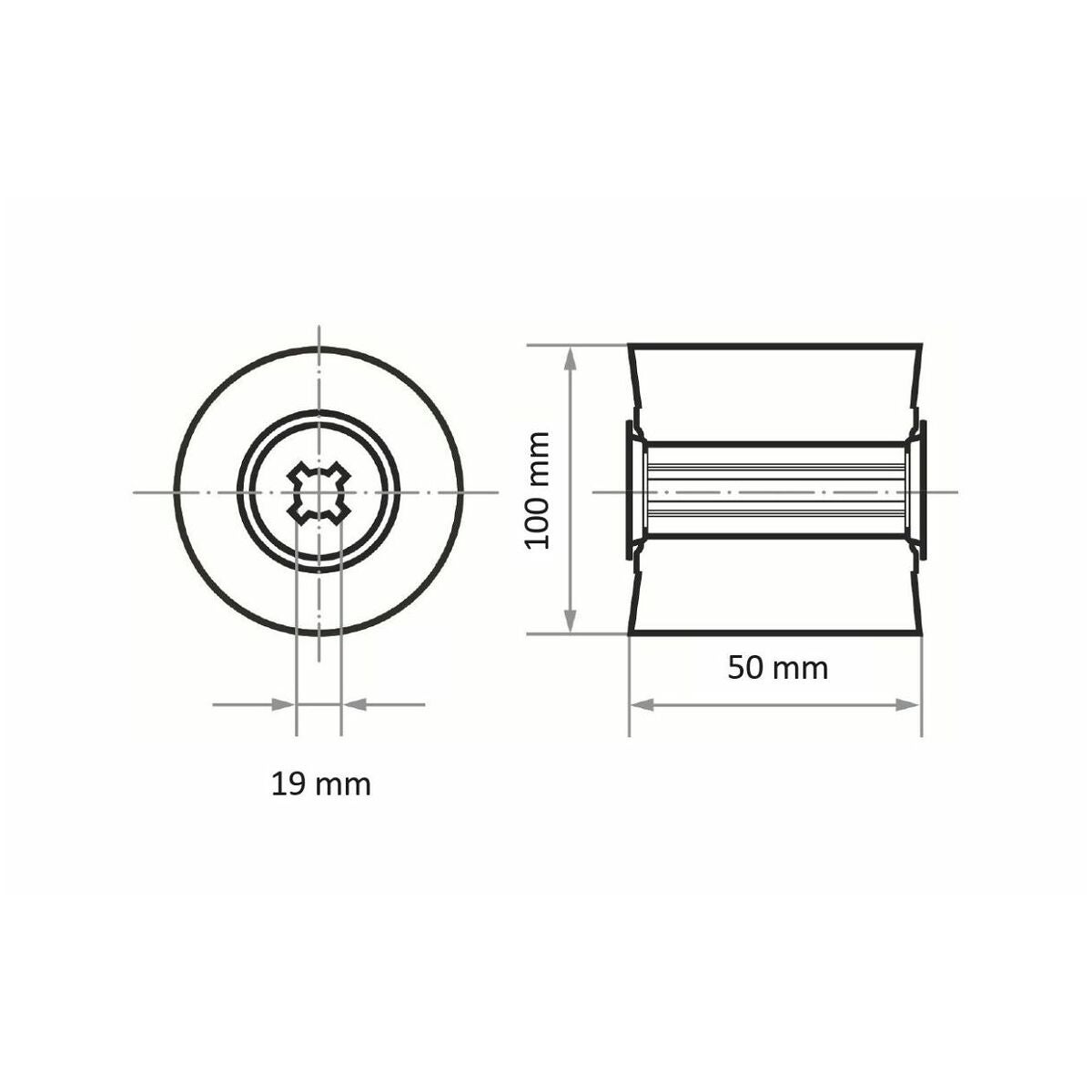 Standardmått ⌀ 100×100 mm resp. smalt utförande ⌀ 100×50 mm för bearbetning av små ytor. Fästhål ⌀ 19 mm med universalkilspår.