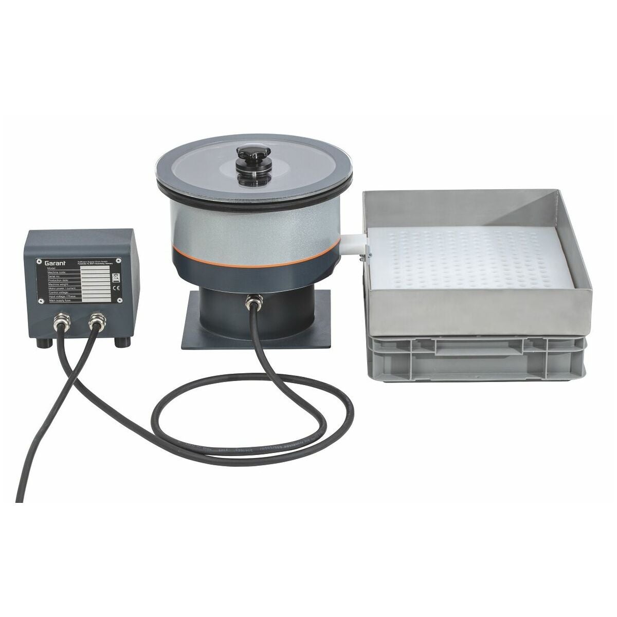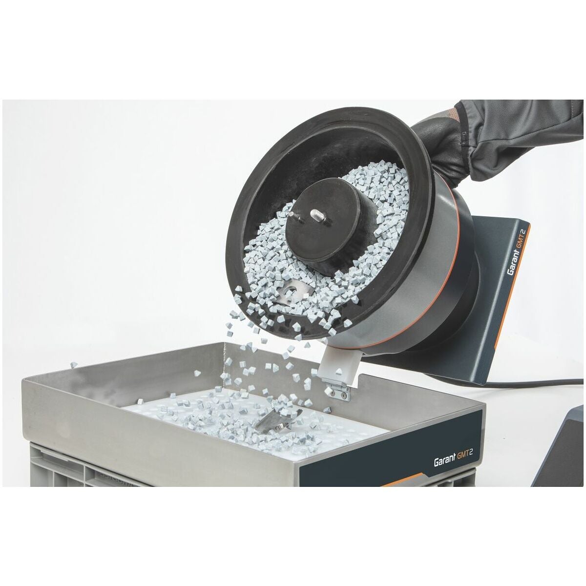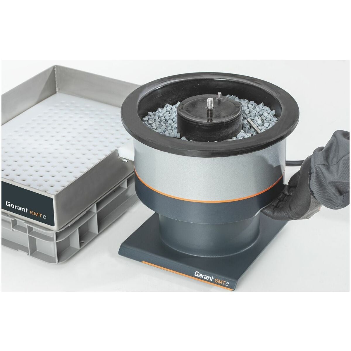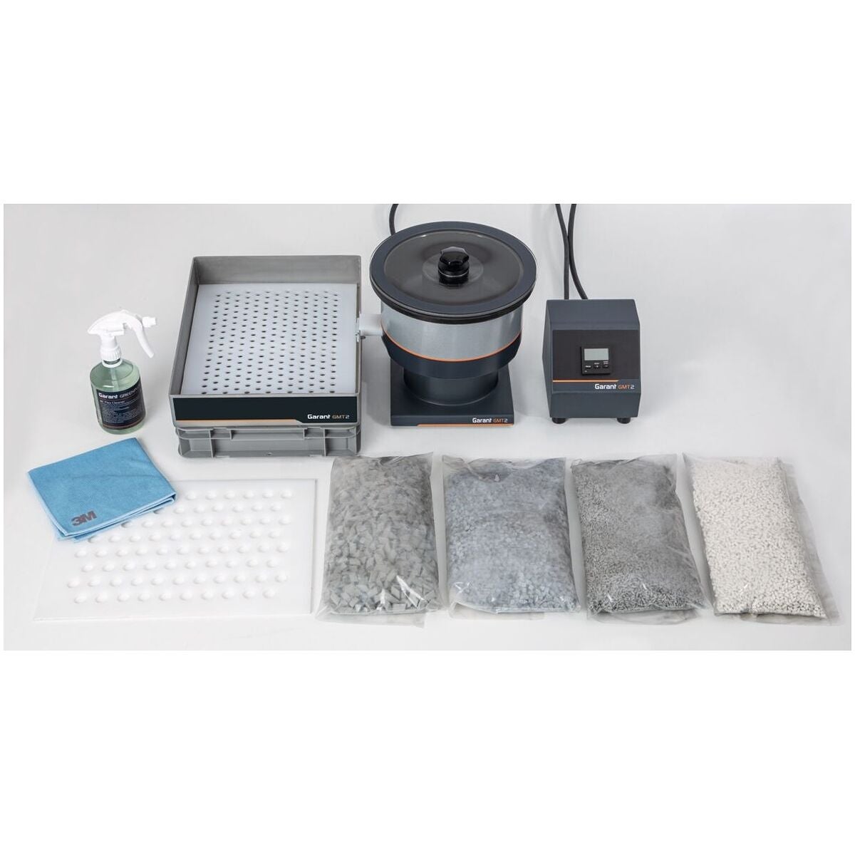 1x glidslipmaskin med kontrollpanel och avtagbar separeringsstation 1x separeringssil med hålgaller 10 mm 1x separeringssil med hålgaller 18 mm 1x keramiskt slipelement (3 kg), triangel, grov (nr 501515 0606T), 1x keramiskt slipelement (3kg), triangel (vinklad), grov (nr 501505 1015TA), 1x keramisk slipelement (3 kg), cylinder (sned), grov (501525 0305CA), 1x porslin-slipelement (3 kg), cylinder (sned), polering (nr 501585 0406CA), 1x förvaringslåda (nr 964486 EF4070), 1x GARANT GreenPlus Flex Cleaner 500 ml (nr 088001 500), 1x GARANT GreenPlus mikrofiberduk (nr 083722 BLUE)Utförande
