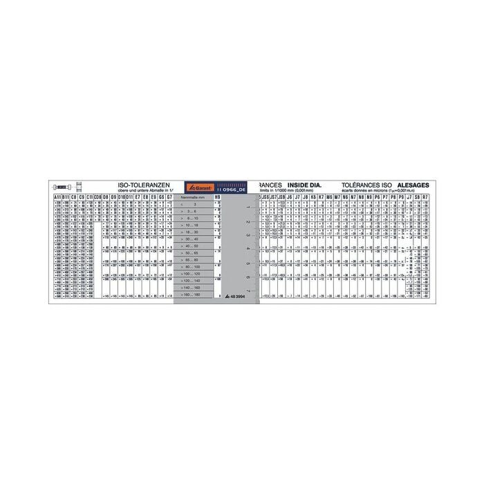Toleransmätaren ger snabbt och enkelt de övre och under dimensionerna på ISO-toleransområdena (till nominellt mått 180 mm). Basplatta med tryck på båda sidor, med avläsningsslid. Av högvärdig plast. Kan användas internationellt tack vare flerspråkig tryckning (tyska, engelska, franska).